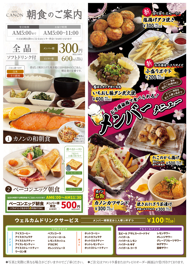 モーニング&メンバーメニューのご案内 2026.04.1 カノンのモーニングメニュー&メンバーメニューのご案内 朝食は全品ソフトドリンク付、メンバー様価格¥300(¥330)でご提供しております。 和朝食・ベーコンエッグトーストからお選びいただけます。 メンバーメニューは¥200(¥220)~¥500(¥550)のお手頃価格で多数ご用意しております♪ おつまみや小腹がすいたときにぜひご利用くださいませ。 ■詳しい内容はこちらをご参照ください■ 一覧へ戻る