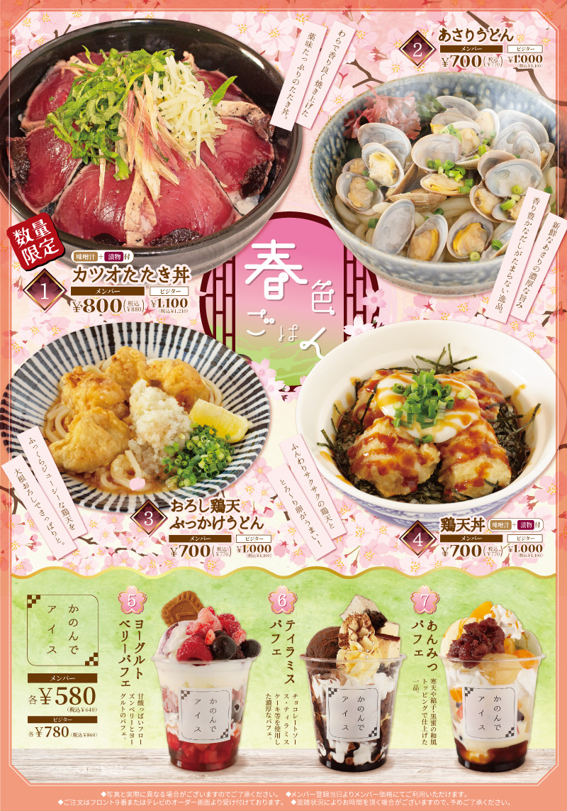 【期間限定】春メニュー登場! 2026.04.1 薬味たっぷり!わらで香り良く焼き上げた【カツオたたき丼】、 新鮮なあさりの濃厚な旨み!【あさりうどん】 ふっくらジューシーな鶏天を大根おろしでさっぱりと。 【おろし鶏天ぶっかけうどん】 ふわサク鶏天ととろ~り卵がうまい!【鶏天丼】 計4品をご用意。 デザートはカノンオリジナルメニューの 「かのんでアイス」から春季限定メニューが登場! 【ヨーグルトベリーパフェ】 【ティラミスパフェ】【あんみつパフェ】 の3品をご用意。 是非ご賞味ください! ■下記画像クリックでメニュー表示!■ 一覧へ戻る